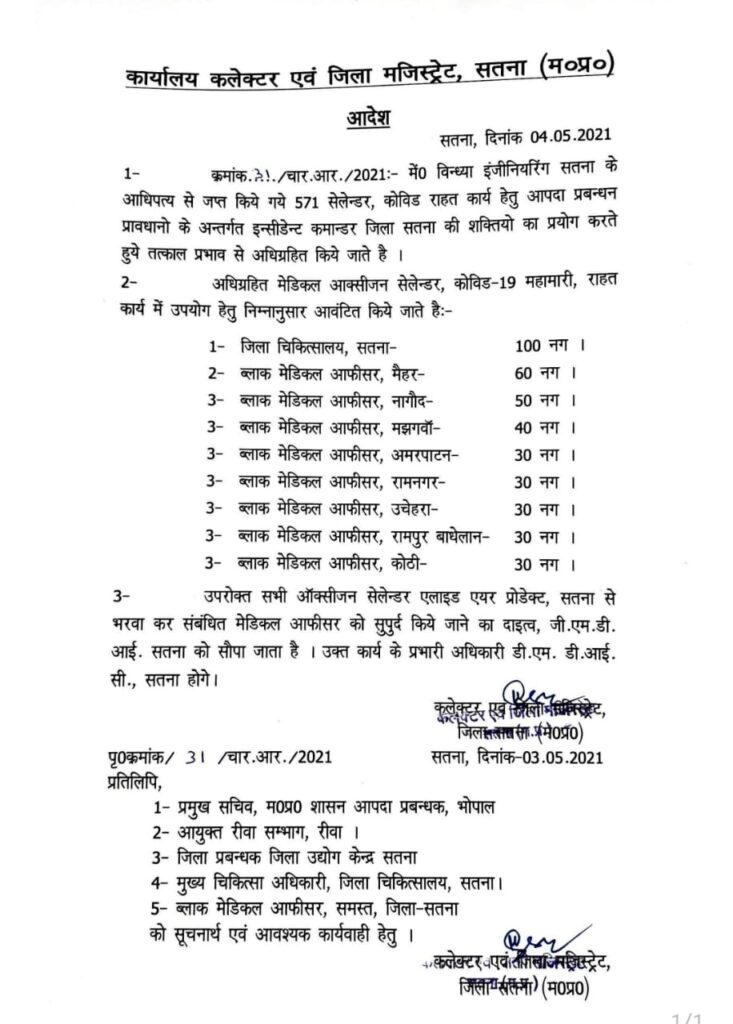 जिला चिकित्सा अधिकारी सतना-100 नग, ब्लॉक मेडिकल ऑफिसर मैहर 60 नग, ब्लॉक मेडिकल ऑफिसर नागौद 50 नग, ब्लॉक मेडिकल ऑफिसर मझगवां 40 नग, ब्लॉक मेडिकल ऑफिसर अमरपाटन 30 नग, ब्लॉक मेडिकल ऑफिसर रामनगर 30 नग ,ब्लॉक मेडिकल ऑफिसर उचेहरा 30 नग, ब्लॉक मेडिकल ऑफिसर रामपुर बघेलान 30 नग ,ब्लॉक मेडिकल ऑफिसर कोठी 30 नग साथ ही सभी ऑक्सीजन सेलेंडर एलायड एअर प्रोडक्ट सतना में भरवा कर मेडिकल ऑफिसर को सुपुर्द किये जाने का दायित्य जी०एम०डी०आई०सौपा जाए और उक्त कार्य के प्रभारी अधिकारी डी०एम०डी०आई०सी० सतना होंगे।