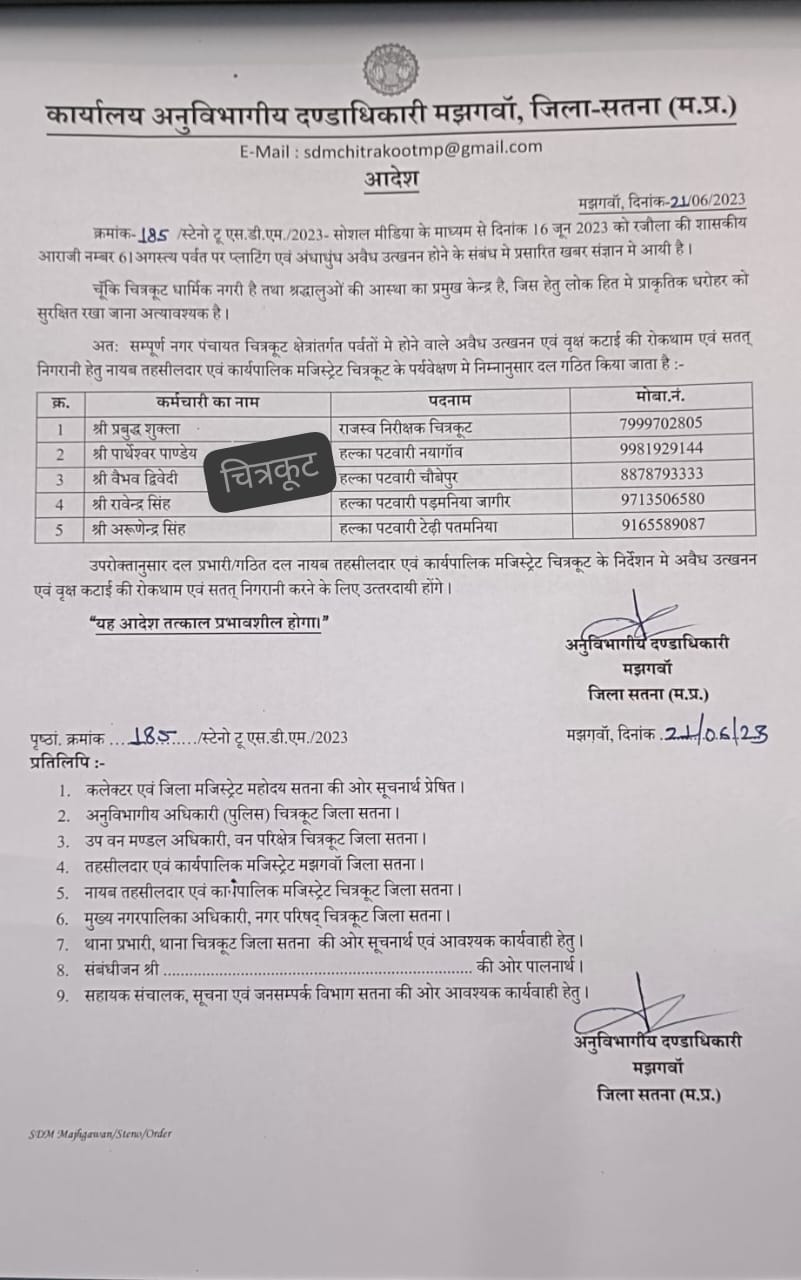 चित्रकूट- धर्मनगरी चित्रकूट में रजौला की शासकीय आराजी अगस्त्य पर्वत पर प्लाटिंग एवं अंधाधुंध हो रहे खनन की खबर सोशल मीडिया में चलने पर मझगवां एसडीएम जितेंद्र कुमार वर्मा ने लिया संज्ञान, अगस्त्य पर्वत सहित सम्पूर्ण नगर परिषद क्षेत्र में पर्वतों पर होने वाले अवैध उत्तखन्न एवं बृक्षों की कटाई की रोकथाम एवं निगरानी के लिए नायब तहसीलदार चित्रकूट के नेतृत्व में गठित की टीम, पूरे चित्रकूट क्षेत्र की निगरानी एवं अवैध उत्खनन एवं बृक्षों की कटाई रोकने के दिये निर्देश!