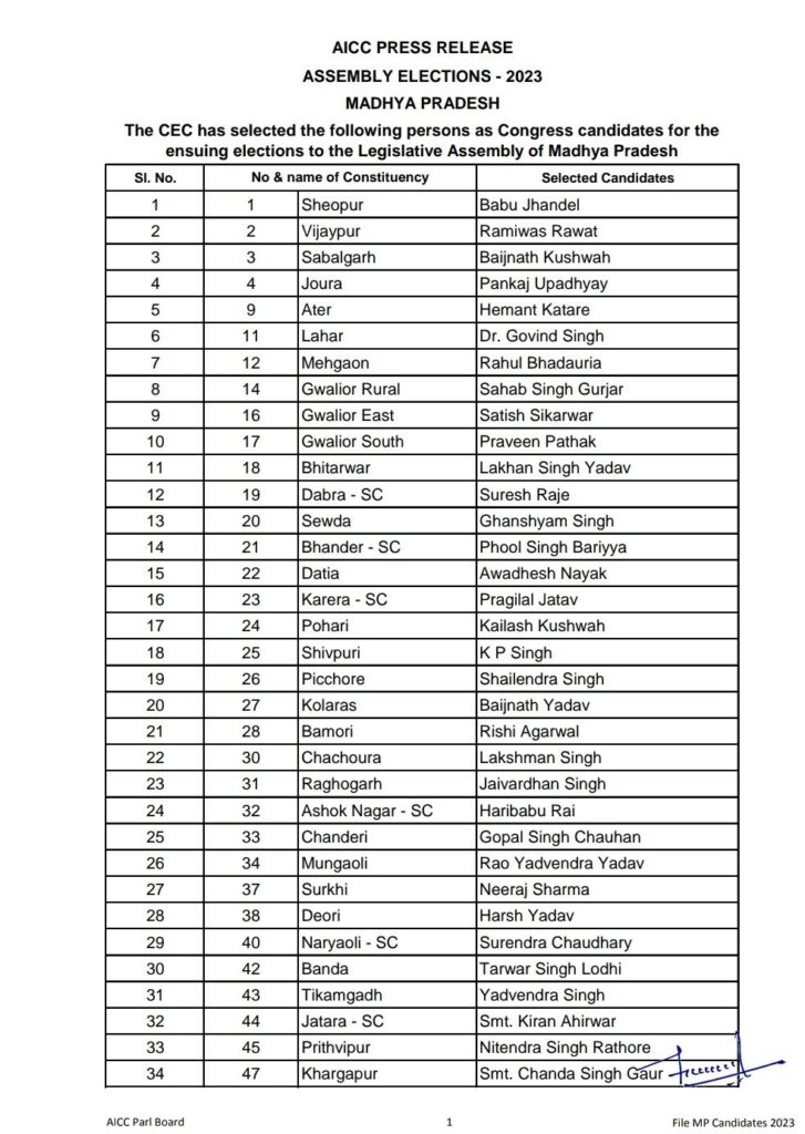मध्य प्रदेश कांग्रेस ने 144 उम्मीदवारों की पहली लिस्ट जारी