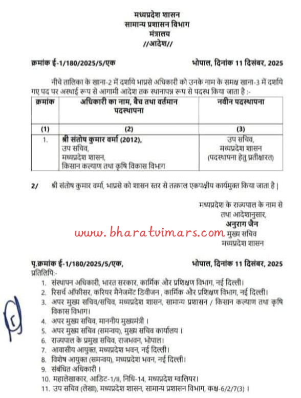 भोपाल – राज्य शासन ने भारतीय प्रशासनिक सेवा भाप्रसे के 2012 बैच के अधिकारी संतोष कुमार वर्मा के पदस्थापन में बदलाव किया है। जारी आदेश के अनुसार, वर्मा वर्तमान में उप सचिव, किसान कल्याण तथा कृषि विकास विभाग के पद से शासन स्तर से एकपक्षीय रूप से तत्काल कार्यमुक्त कर दिए गए हैं।