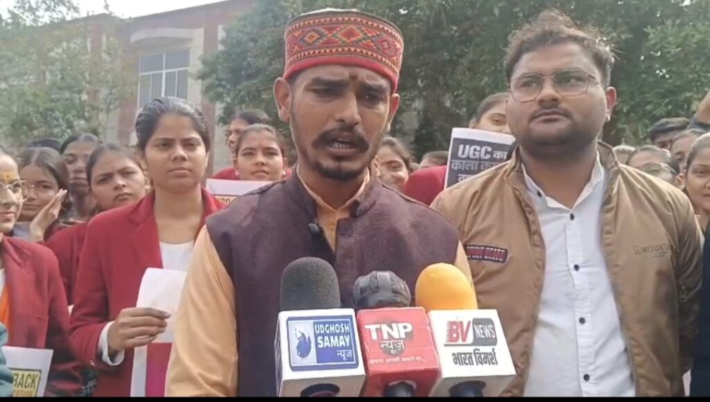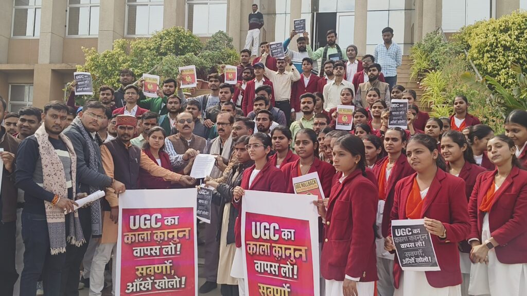 चित्रकूट – पूरे देश के विश्वविद्यालयों में यूजीसी ( यूनिवर्सिटी ग्रांट कमीशन) द्वारा लागू किए गए सवर्ण छात्र विरोधी कानूनों का सारे देश में भारी विरोध हो रहा है।सवर्ण छात्र इसे काला कानून बताकर वापस लेने की मांग कर रहे हैं।विरोध की आग चित्रकूट में भी पहुंच चुकी है।गुरुवार को चित्रकूट स्थित ग्रामोदय विश्वविद्यालय के छात्र छात्राओं द्वारा भी यूजीसी कानून का विरोध शुरु कर दिया गया।विश्वविद्यालय के छात्र छात्राओं द्वारा हाथों में यूजीसी काला कानून वापस लो,के बैनर पोस्टर लेकर नारे लगाते हुए पूरे विश्वविद्यालय कैंपस में घूम घूम कर इस कानून का विरोध किया गया।और कुल सचिव के प्रतिनिधि अशोक चतुर्वेदी के माध्यम से ज्ञापन राष्ट्रपति को भेजकर यूजीसी कानून को वापस लेने की मांग की गई।छात्र नेता ओमराज तिवारी द्वारा कहा गया कि सरकार इस काले कानून को लाकर आपसी माहौल को खराब करना चाहती है।विश्वविद्यालयों के अंदर कभी भी छात्रों में जातिवादी भावना नहीं थी।लेकिन सरकार और नेता पढ़ने वाले छात्रों के बीच जातिवादी बीज बोकर आपसी माहौल को खराब करना चाहते हैं।जब तक यह कानून वापस नहीं होता,इसका विरोध जारी रहेगा।छात्रा खुशी सिंह ने कहा कि GEN G से डरकर सरकार द्वारा यूजीसी के माध्यम से इस प्रकार कानून लाकर छात्रों के बीच मतभेद पैदा करने का प्रयास किया जा रहा है।जिसे सफल नहीं होने दिया जायेगा।जब तक यह कानून वापस नहीं होता,हम लोग इसका विरोध करते रहेंगे।