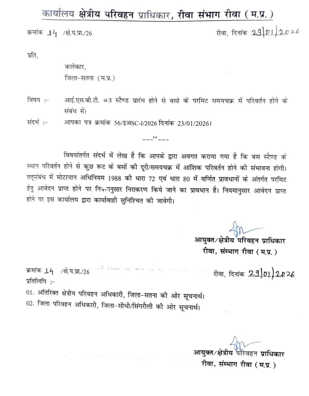 सतना – मोटरयान अधिनियम 1988 की धारा 72 एवं 80 के प्रावधान के अनुसार बस ऑपरेटर्स को परमिट समय चक्र में परिवर्तन के लिए रीजनल ट्रांसपोर्ट अथॉरिटी को विधिवत आवेदन करना होगा। उनका यथोचित निराकरण आरटीए द्वारा नियमानुसार किया जाएगा। कमिश्नर एवं रीजनल ट्रांसपोर्ट अथारिटी बीएस जामोद ने सतना कलेक्टर डॉ. सतीश कुमार एस कोमें पत्र भेजकर संभाग के सभी जिलों के आरटीओ को प्रावधानों का पालन करने के निर्देश दिए हैं।