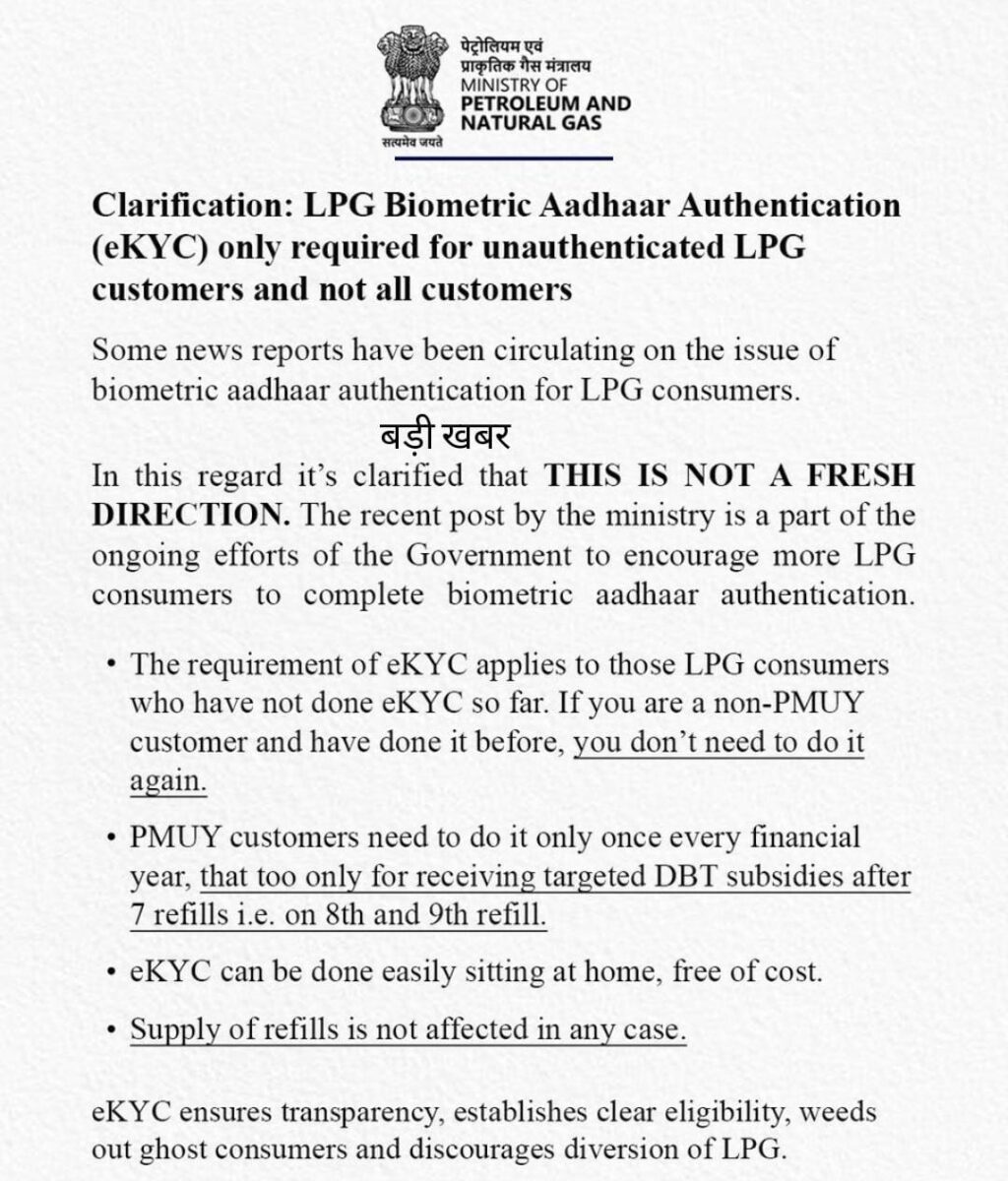 भोपाल – पेट्रोलियम मंत्रालय ने साफ किया है कि बायोमेट्रिक आधार प्रमाणीकरण केवल उन ग्राहकों के लिए अनिवार्य है, जिनकी E-KYC अभी तक अधूरी है। जिन सामान्य उपभोक्ताओं (गैर-PMUY) ने यह प्रक्रिया पहले ही पूरी कर ली है, उन्हें इसे दोहराने की आवश्यकता नहीं है। इससे उपभोक्ताओं को राहत मिलेगी।