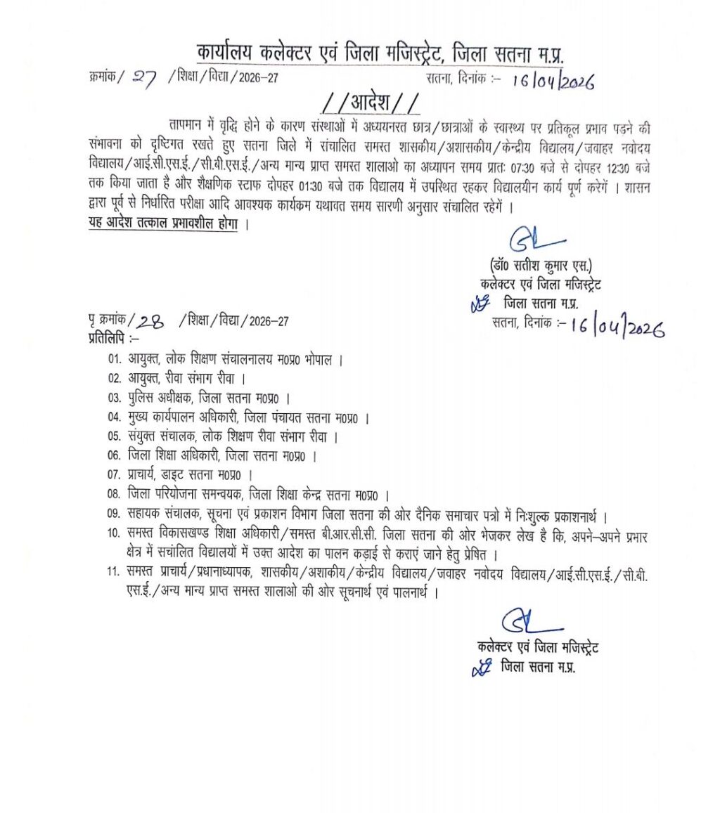 सतना – कलेक्टर डॉ सतीश कुमार एस ने जारी किया स्कूलों के खुलने के समय में परिवर्तन का आदेश, सतना जिले में गर्मी के दृष्टिगत स्कूल प्रातः7.30 बजे से दोपहर 1.30 बजे तक लगेंगे।यह आदेश सतना जिले में संचालित समस्त शासकीय, अशासकीय, केन्द्रीय विद्यालय , जवाहर नवोदय विद्यालय ,आई.सी.एस.ई.,सी.बी.एस.ई., अन्य मानता प्राप्त समस्त शालाओ में लागू होगा और शैक्षणिक स्टाफ दोपहर 01:30 बजे तक विद्यालय में उपस्थित रहकर विद्यालयीन कार्य पूर्ण करेगें। शासन द्वारा पूर्व से निर्धारित परीक्षा आदि आवश्यक कार्यकम यथावत समय सारणी अनुसार संचालित रहेगें ।