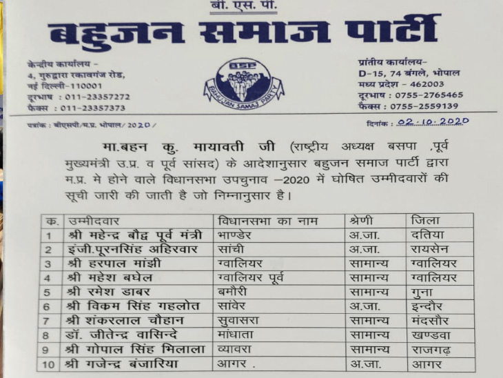 एमपी विधानसभा उपचुनाव के लिए बसपा ने जारी की दूसरी सूची